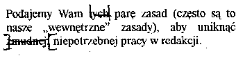 PS 3. Oczywiście nie trzeba odsyłać redakcji pliku z zasadami korekty, a jeśli nie ma zastrzeżeń do samej korekty, to nie trzeba odsyłać również pliku czy wydruku z tekstem - wystarczy informacja o akceptacji zaproponowanej korekty.